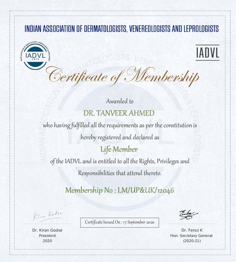 He is a Lifetime Member of IADVL (Indian Association of Dermatologists, Venereologists and Leprologists), reflecting his commitment to professional excellence and updated dermatology practices.